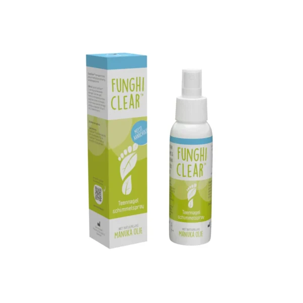 FunghiClear™ Anti-schimmel Spray is een anti-schimmel spray voor de voeten met unieke eigenschappen en 100% natuurlijke actieve ingrediënten, zoals Manuka olie. FunghiClear™ Anti-schimmel Spray helpt om jouw voeten blij en gezond te maken door teennagelschimmel (“kalknagel”), voetschimmels en onychomycose te bestrijden en voorkomen. Uit onderzoek is gebleken dat FunghiClear™ bij regelmatig gebruik (minimaal 3 tot 4 maanden) tot de beste resultaten leidt.